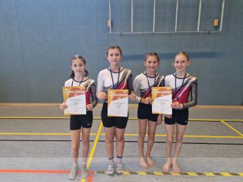 Großen Erfolg gab es auch im Wettkampf 18 (Jahrgang 2014): Die Mannschaft Blaichach 1 mit Serina Köberle, Hermine Nölp, Lina Veser und Jana Skarke erturnte sich den 1. Platz.